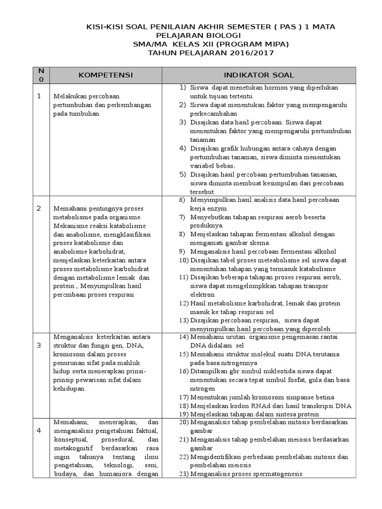 Kisi Kisi Soal Pas 1 Biologi Kelas Xii Mipa