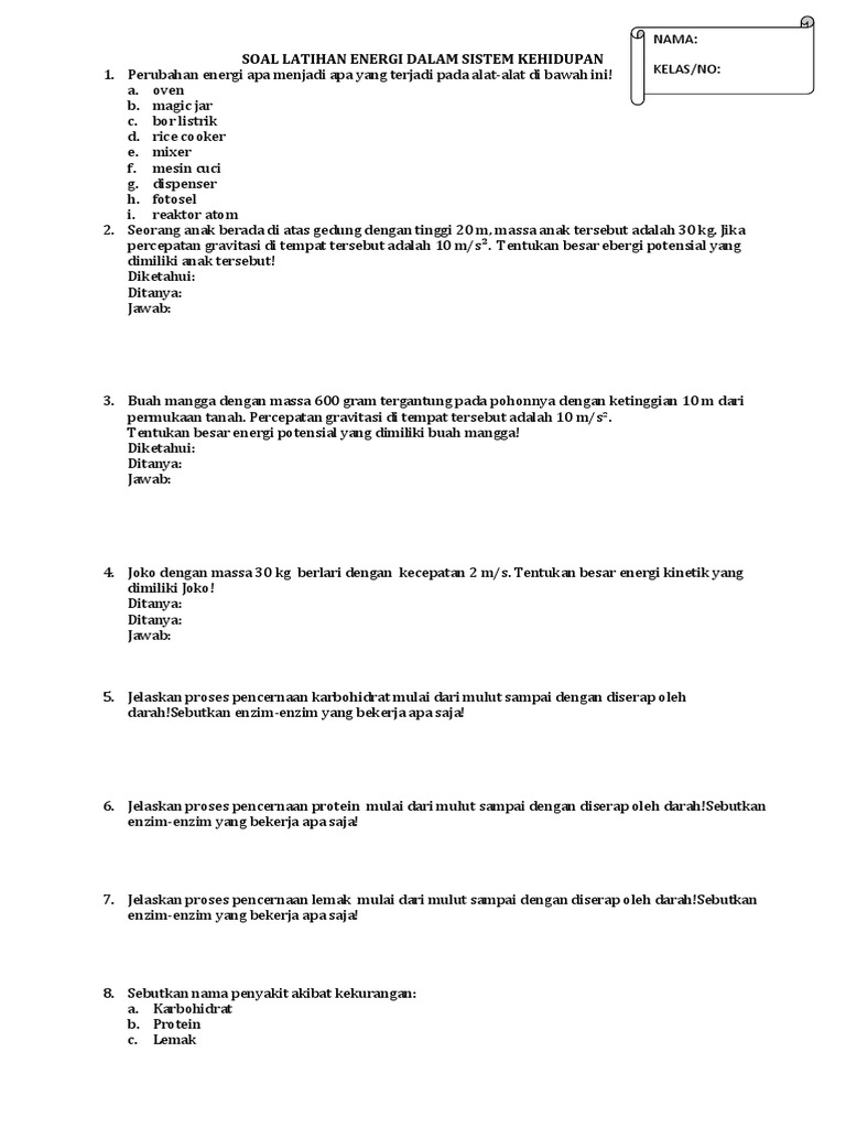 Latihan Soal Ipa Kelas 7 Smp Mts K13 Energi Dalam Sistem Kehidupan