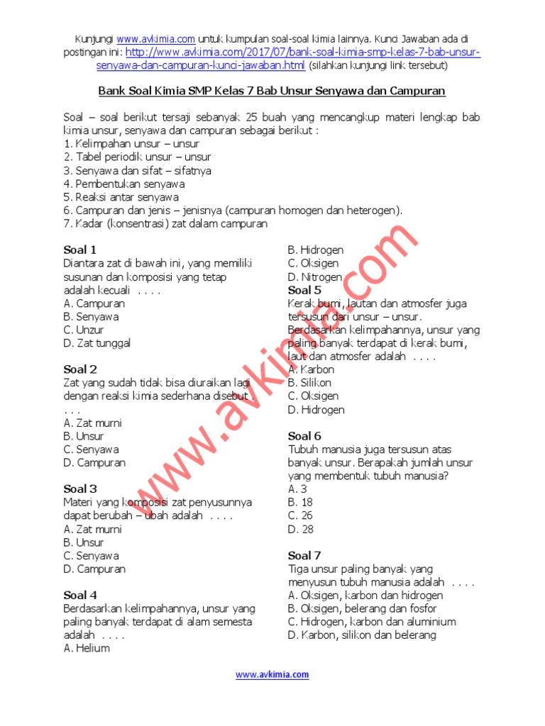 Bank Soal Kimia Smp Kelas 7 Bab Unsur Senyawa Dan Campuran