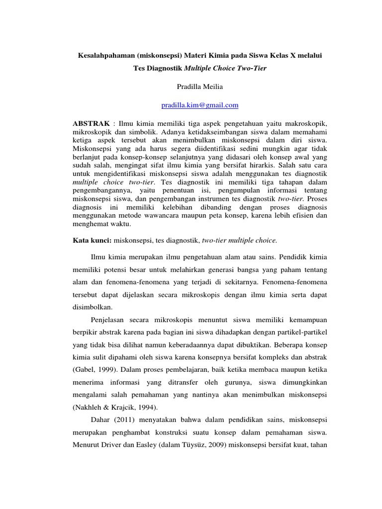 Pengembangan Instrumen Tes Diagnostik Three tier Pendeteksi Miskonsepsi Model CBT pada Materi Laju Reaksi. Kisi-Kisi Soal PAS Kimia Kelas 10 Teman-teman guru semuanya pada artikel kali ini saya akan berbagi file tentang Kisi-Kisi Soal PAS Kimia Kelas 10. Pengembangan Tes Diagnostik Two-Tier untuk Mengidentifikasi Miskonsepsi pada Materi Kimia Siswa SMA.