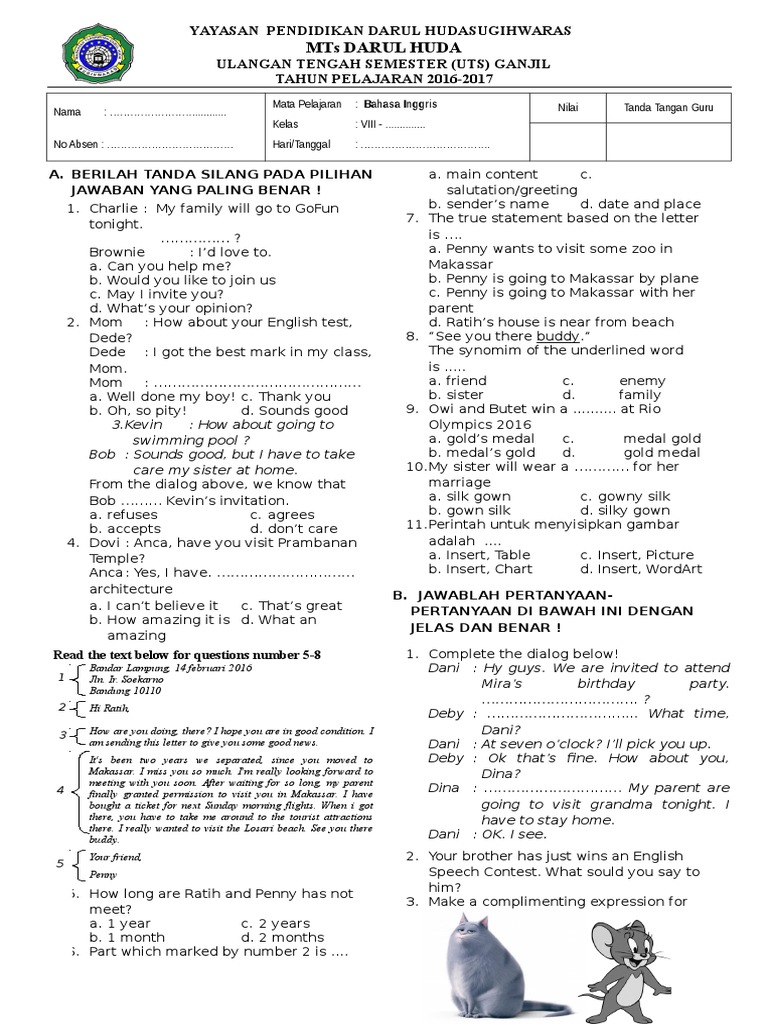 Soal Ulangan Harian Bahasa Inggris Kelas 7. Soal bahasa inggris kelas 8 ini berguna untuk mengasah pemahaman materi bahasa inggris yang telah dipelajari selama setengah semester. Kelas 2 Semester 1.