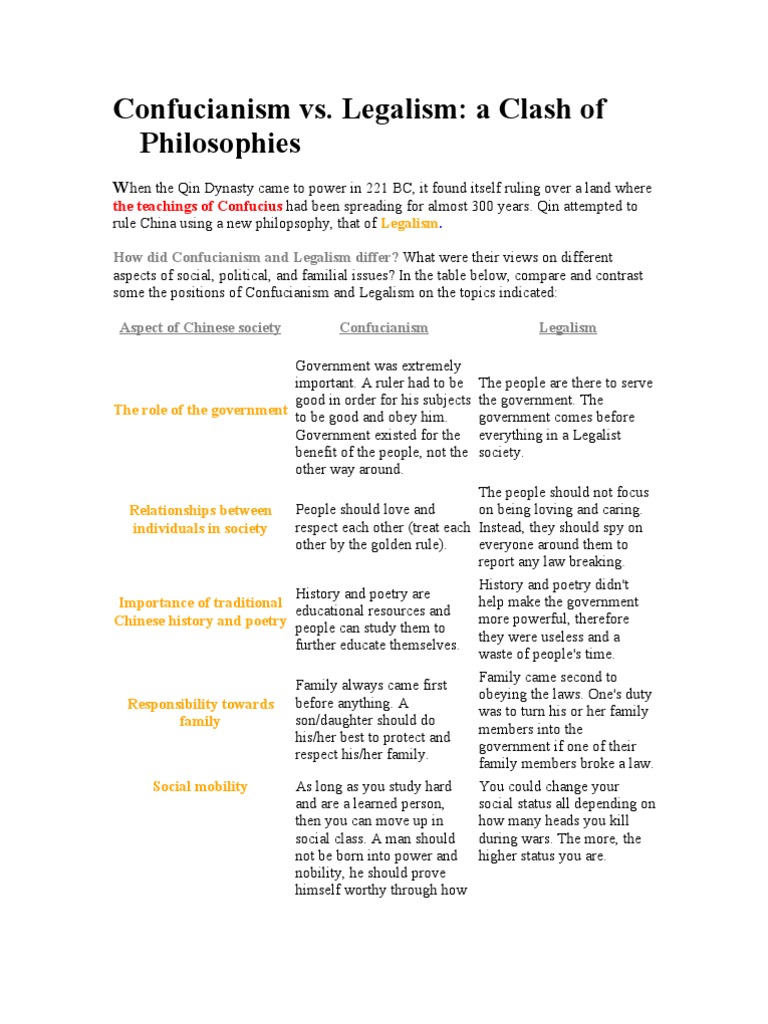 A clash of philosophies when the qin dynasty came to power in 221 bc, it found itself ruling over a land where the teachings of confucius had been spreading for almost 300. Pronunciation key confucianism (kun few shun izm) confucius (kun few shus) kongzi (kong zuh) li si (lee suh) qin (chin). Confucianism vs daoism vs legalism— presentation transcript Daoism, more commonly known as taoism, was taught by lao tzu. Why we think confucianism is better. Confucianism sought to help streamline society and encourage proper participation in politics. It is based on the notion that law without morality. A system of philosophical and ethical teachings founded by confucius. Which is a better way to govern? In this paper i will explore and provide my own insights on the shortcomings of both ideologies; Legalism and confucianism were two of the philosophies intellectual thinkers developed to try and stop the. These laws were lighter and led to education reforms improving literacy. In this paper i will explore and provide my own 20, 2013 a look at human nature & confucianism vs.