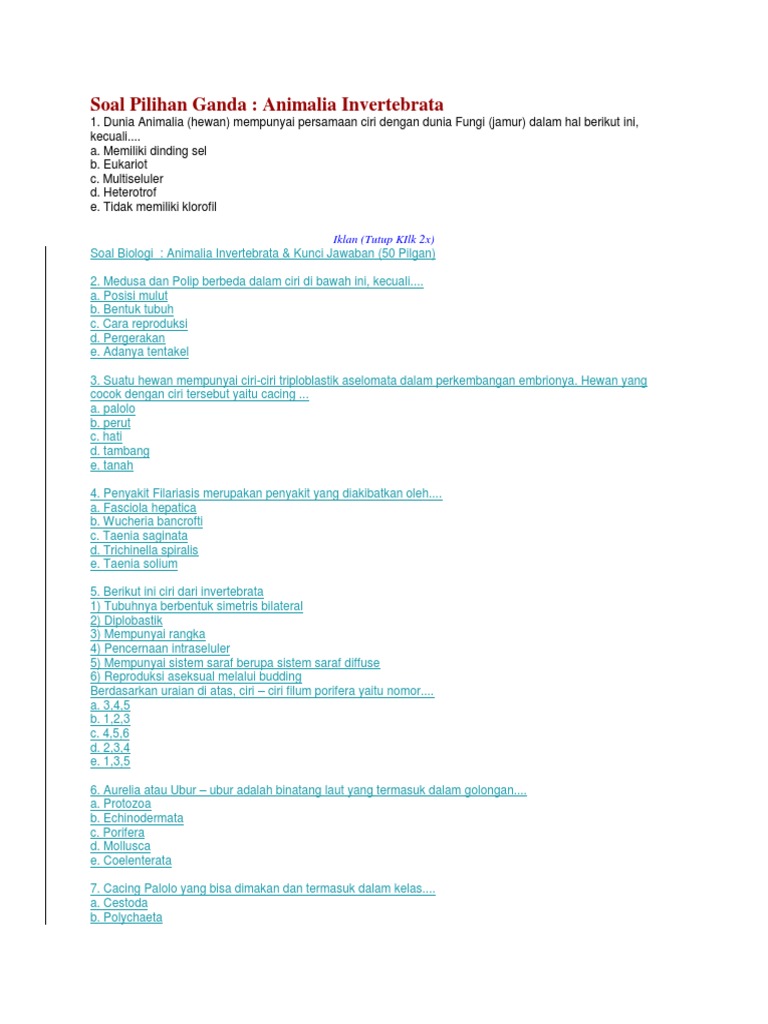 Homepage Biologi Contoh Soal Hewan Invertebrata Pilihan Ganda dan Jawaban Oleh Soal Pelajaran Diposting pada 11042020 11042020 Contoh Soal Hewan Invertebrata Pilihan Ganda beserta Pembahasan Hewan invertebrata merupakan hewan yang tidak memiliki tulang belakang dan perkembangannya organnya masih sangat sederhana. Suatu cacing pipih hidup sebagai parasit dalam usus halus manusia sedangkan. Manusia berarti mahluk yang berakal budi dan mampu menguasai mahluk lain.