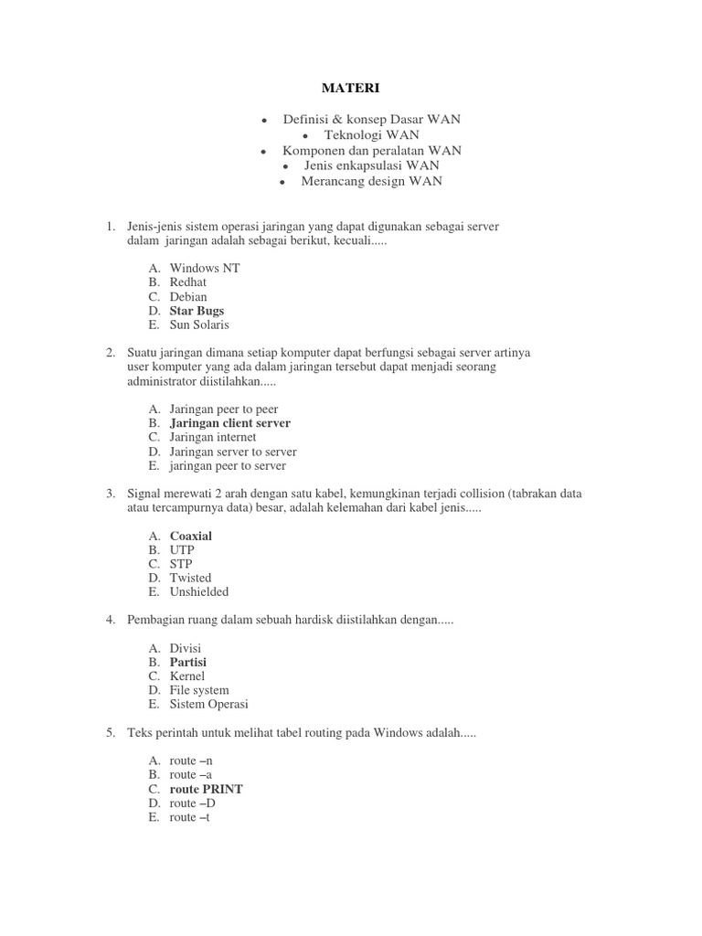 30 soal Instalasi perangkat jaringan berbasis luas LAN WAN Description. Jawaban untuk soal pilgan yang tulisannya berwana hitam tebal ya sobat. IEEE 80211 adalah sebuah standar untuk implementasi jaringan Wireless atau Nirkabel pada frekuensi band 24 36 dan 5 GHz.