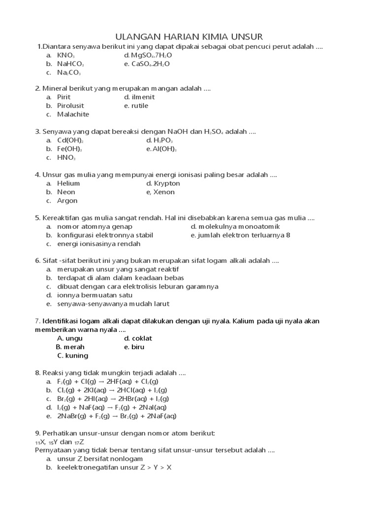 Contoh Soal Kimia Unsur dan Pembahasan Kelas 12 Pilihan Ganda dan Jawaban Unsur kimia merupakan suatu spesies atom yang memiliki jumlah proton yang sama dalam inti atomnyaSebanyak 118 unsur telah diidentifikasi yang 94 di antaranya terjadi secara alami di bumi.